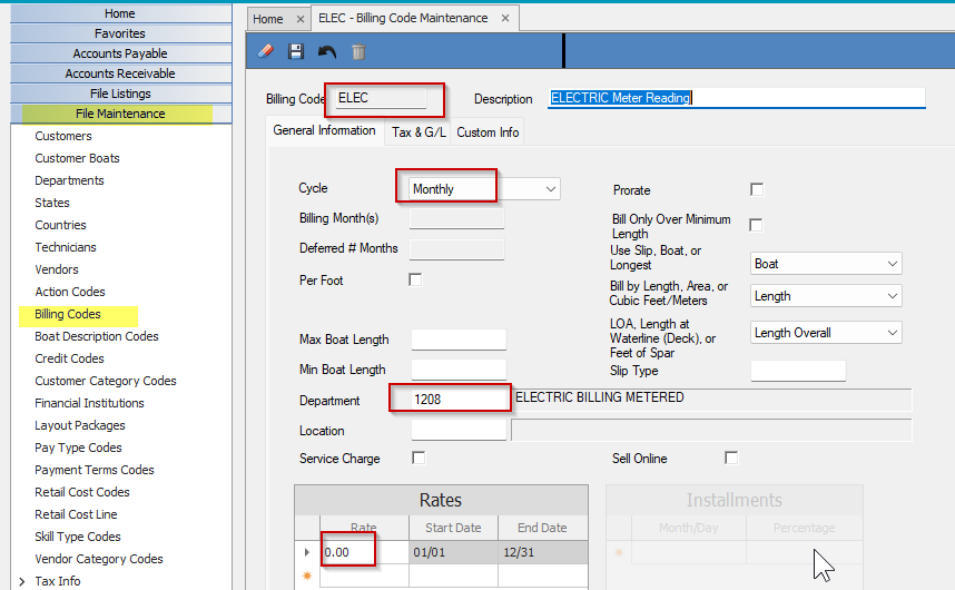 This billing code will NOT be used for calculation if readings are imported. It is required to open the Meter Reading Form.